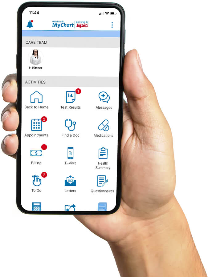 One of the most powerful tools for managing your health is OhioHealth MyChart, which we’ve made amazingly easy to use in the OhioHealth app. Communicate privately and securely with your doctors and their teams, review your health history, request prescription refills, view test results, and have a telehealth online video visit with your doctor. And if you or a loved one is admitted to a hospital, you can use MyChart to track updates about your hospital stay.